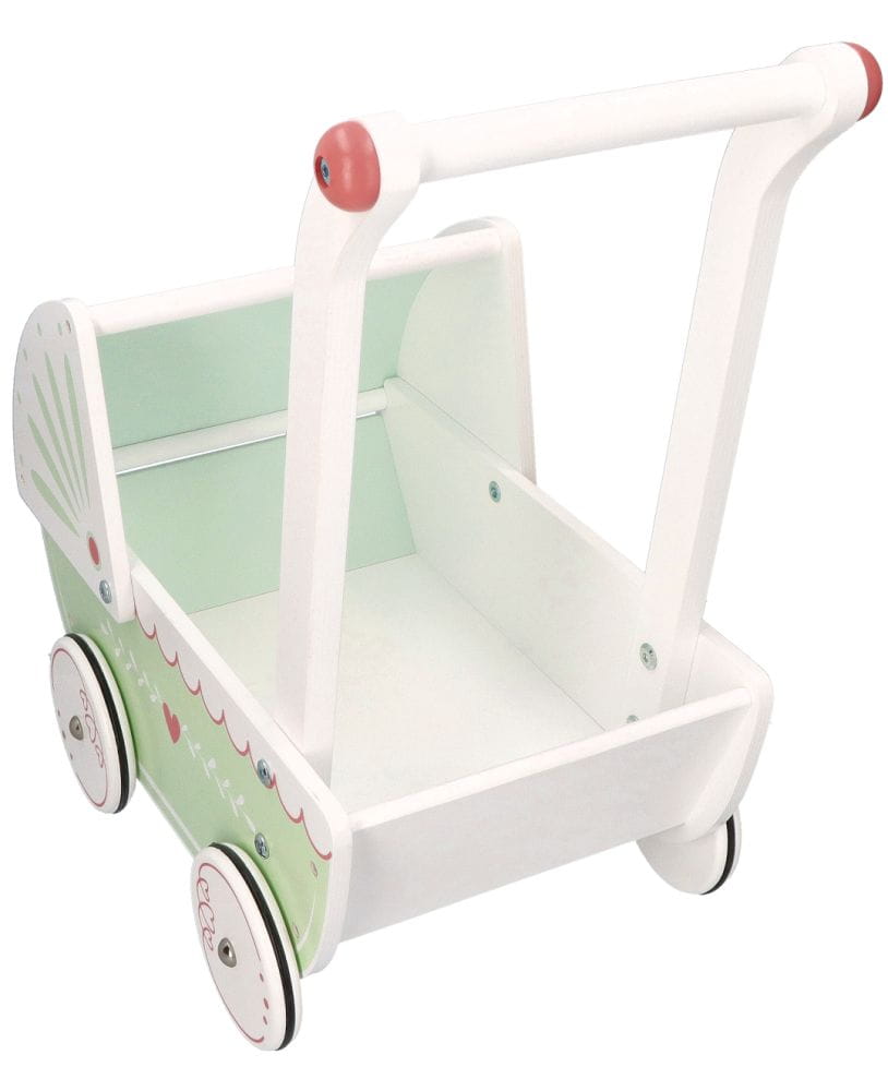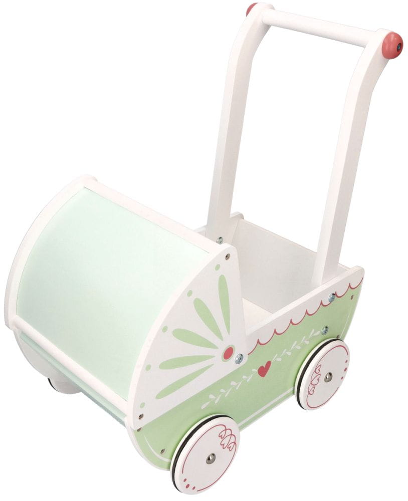 Wózek ma śliczny, delikatny design, z odrobiną różu i biało-miętową kolorystyką, co sprawia, że pasuje do różnych stylizacji, lalek i pokoików. Estetyczny wygląd wózka dodaje mu uroku. Wózek jest wykonany z drewna, co sprawia, że jest stabilny, trwały i ma wysoką jakość. Materiał ten nadaje wózkowi wytrzymałość, która jest istotna podczas zabawy i użytkowania. Kółeczka wózka mają gumki antypoślizgowe, co zapewnia lepszą przyczepność i bezpieczeństwo podczas spacerów. Budka wózka ma owalny kształt i jest osobnym elementem, co nadaje wózkowi bardziej autentyczny wygląd. Ma wygiętą rączkę, która ułatwia pchanie i chodzenie z wózkiem.