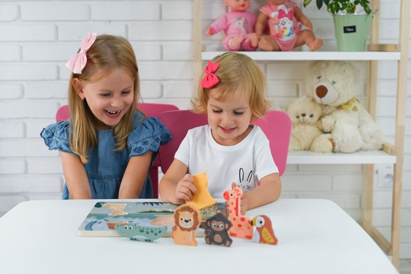 Poprzez dopasowywanie elementów układanki do odpowiednich miejsc, maluch poznaje różne zwierzęta z safari, takie jak małpka, papuga, gepard, krokodyl, żyrafa i lew. Jest to świetny sposób na edukację i wprowadzenie dziecka w świat dzikiej przyrody.