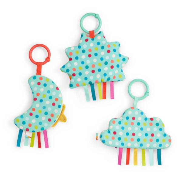 Dodatkowo, kolorowe wstążki zachęcają do chwytania, co pomaga rozwijać koordynację wzrokowo-ruchową. Tył każdej zabawki jest ozdobiony atrakcyjnym wzorem w kolorowe grochy. Zabawki wyposażono w praktyczne pierścienie, umożliwiające łatwe przyczepienie do łóżeczka czy wózka.