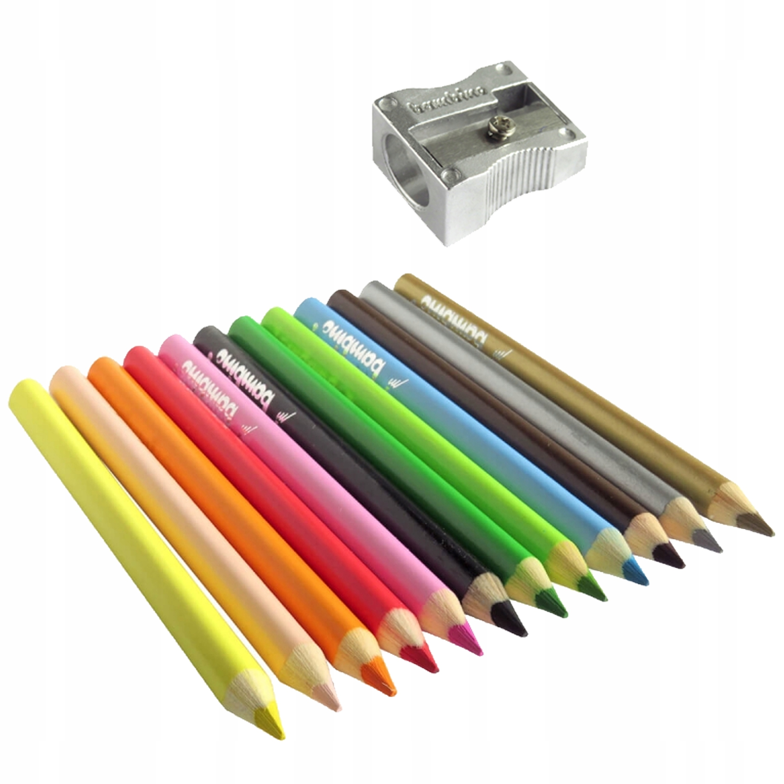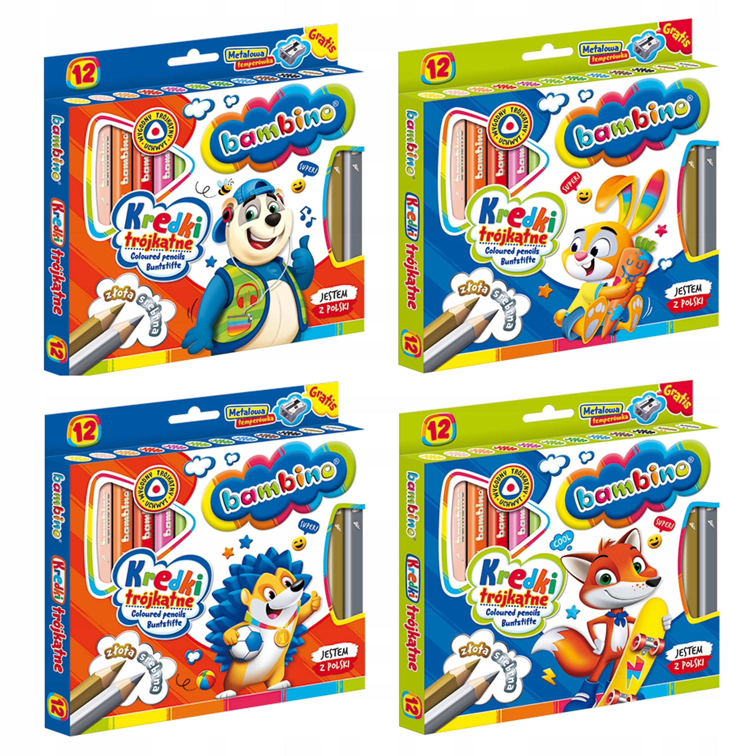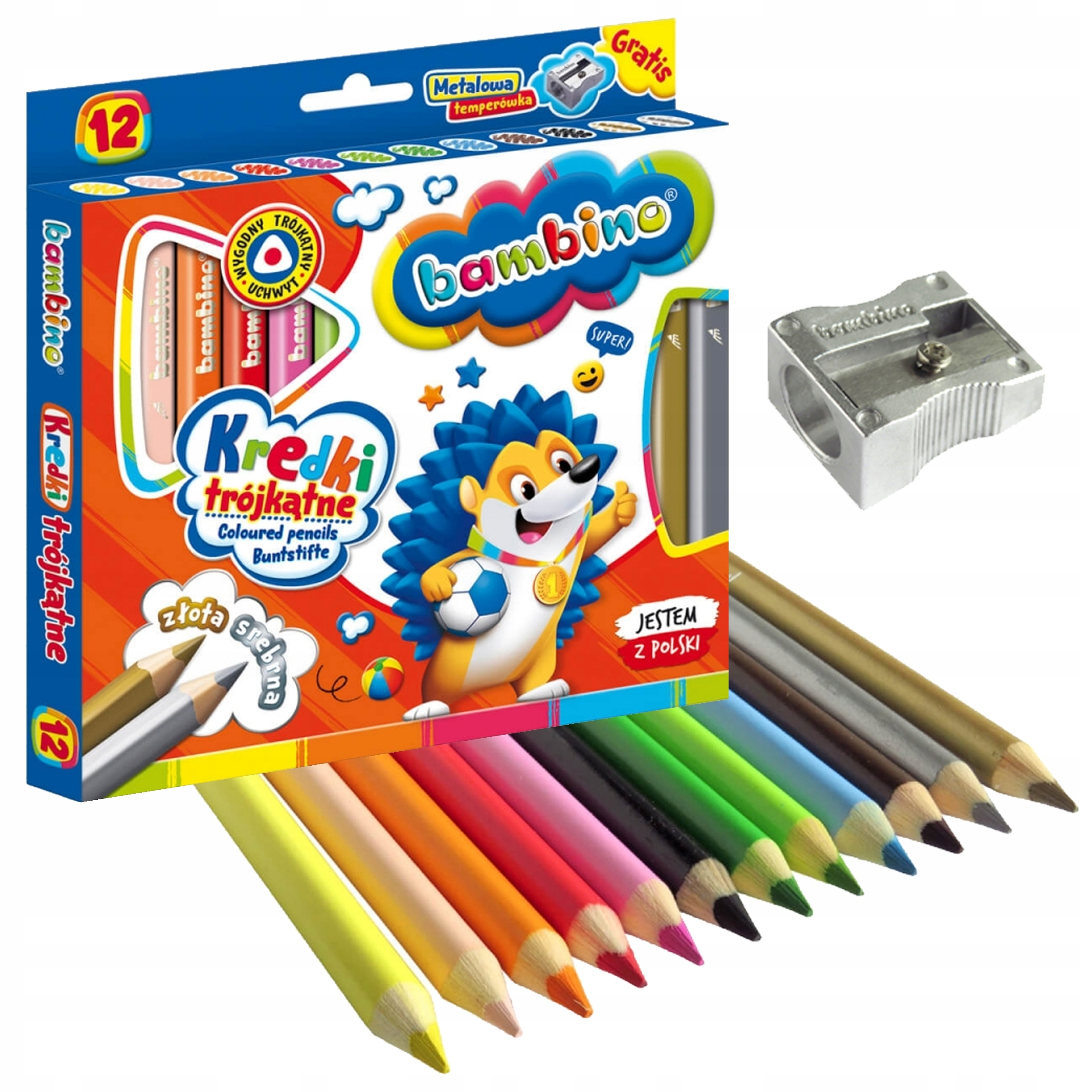 - Kredki BAMBINO w drewnianej oprawie o trójkątnym przekroju, 12 kolorów, z dołączoną temperówką.