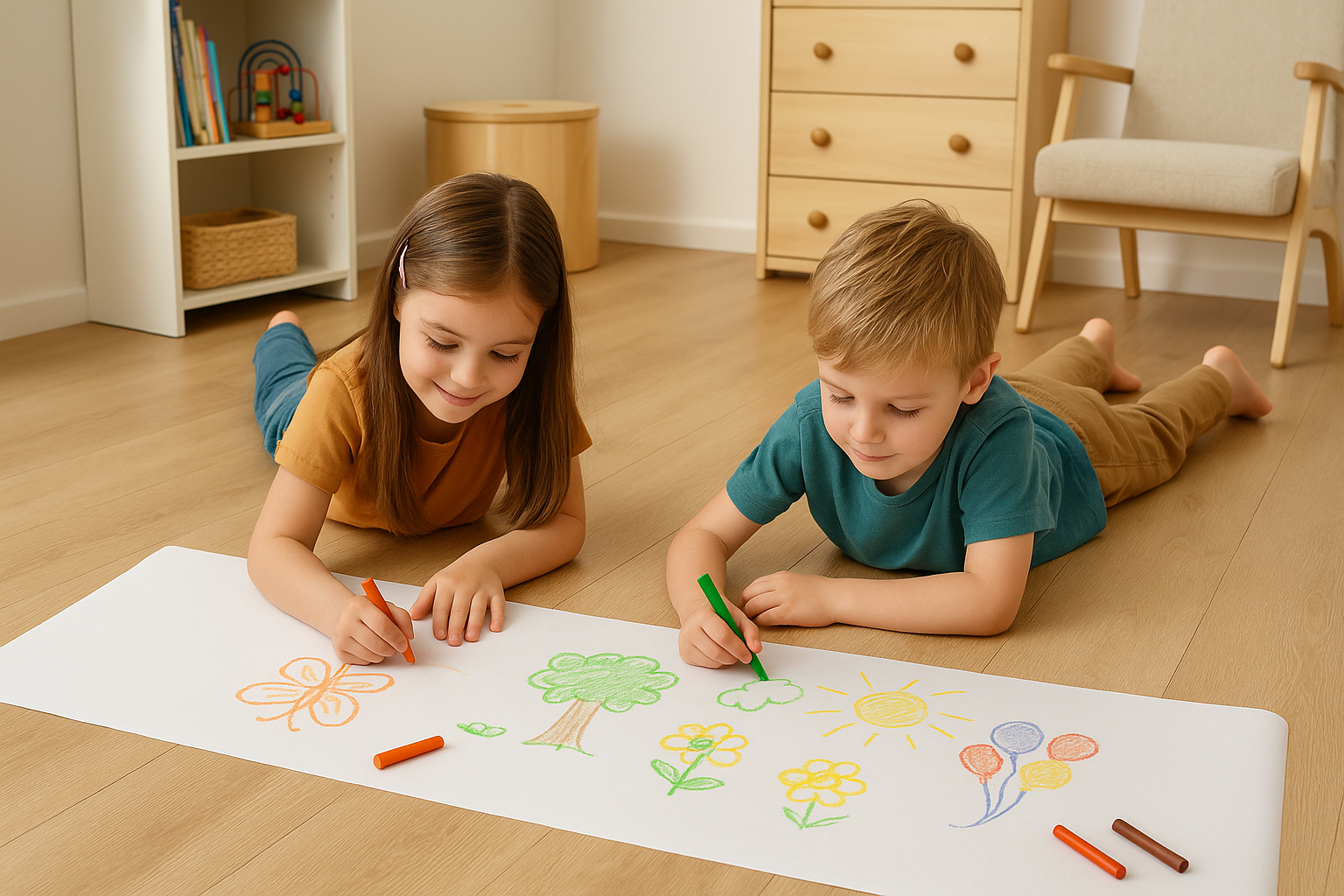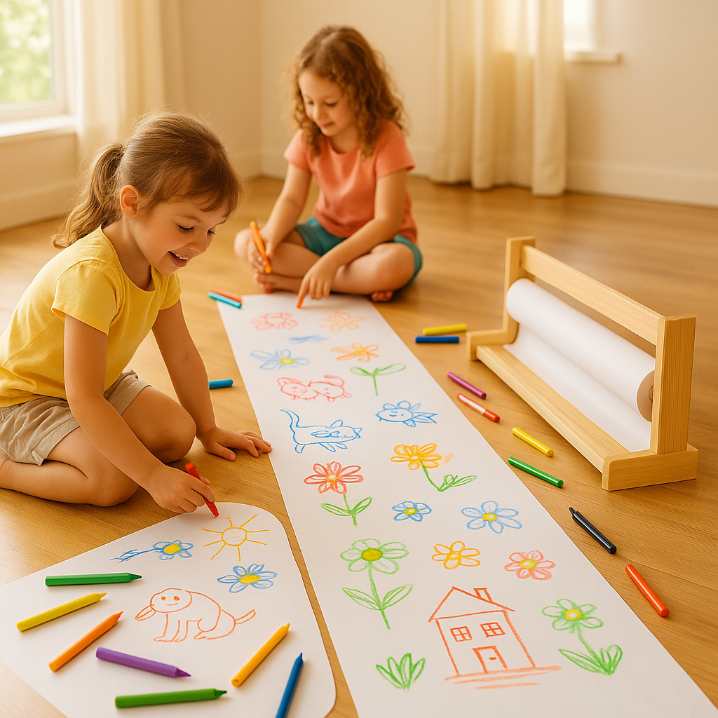 Długi pas papieru staje się nie tylko miejscem na rysunki, ale także polem do wspólnego tworzenia z rówieśnikami. To świetny wybór do: