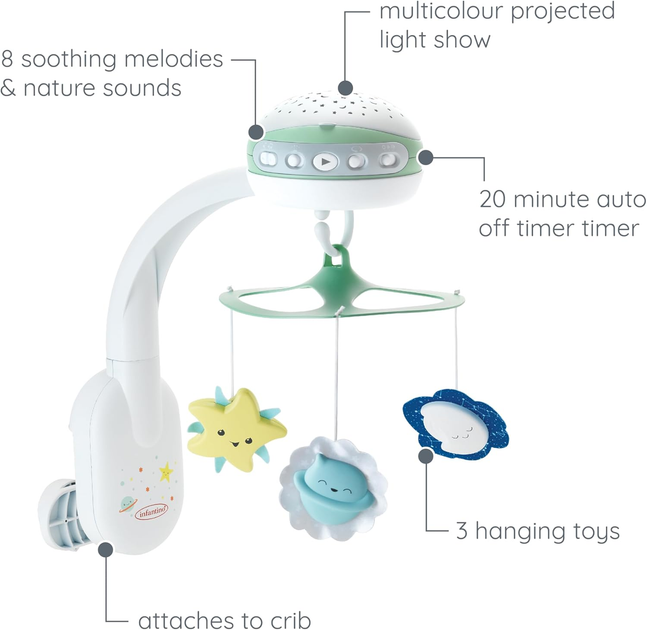 Karuzela 3 w 1 to wielofunkcyjne rozwiązanie, które rośnie razem z dzieckiem, zapewniając mu poczucie bezpieczeństwa i harmonijny sen. Dzięki inteligentnemu czujnikowi dźwięku, projektor reaguje na płacz malucha, otaczając go uspokajającymi dźwiękami i delikatnym światłem gwiazd.
