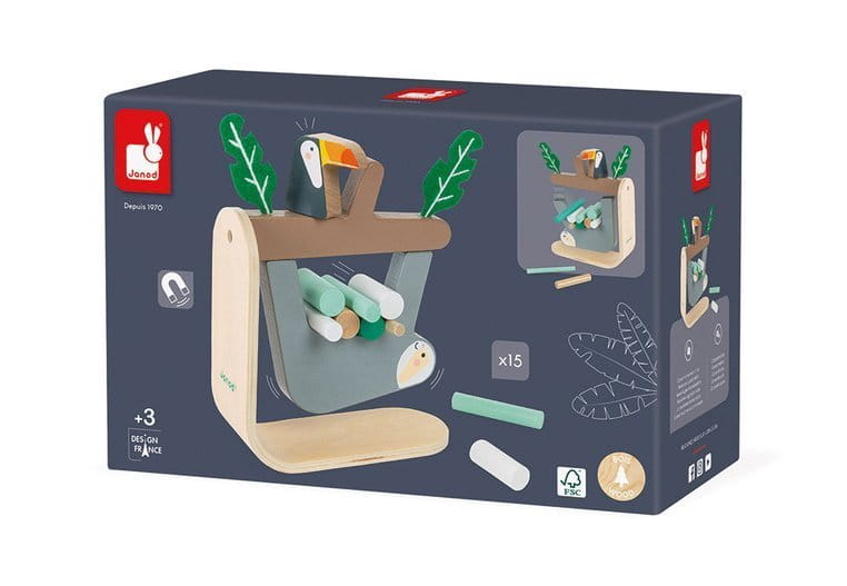 Wspaniała zabawa, w której może uczestniczyć więcej osób lub można grać w pojedynkę. Na gałęzi drzewa wisi sympatyczny leniwiec. Zadanie polega na delikatnym układaniu patyczków w przestrzeń między gałęzią a zwierzątkiem tak, aby nie upadł na ziemię. Całej rozgrywce przygląda się zza filcowych liści drewniany tukan. To jak podejmiesz wyzwanie?