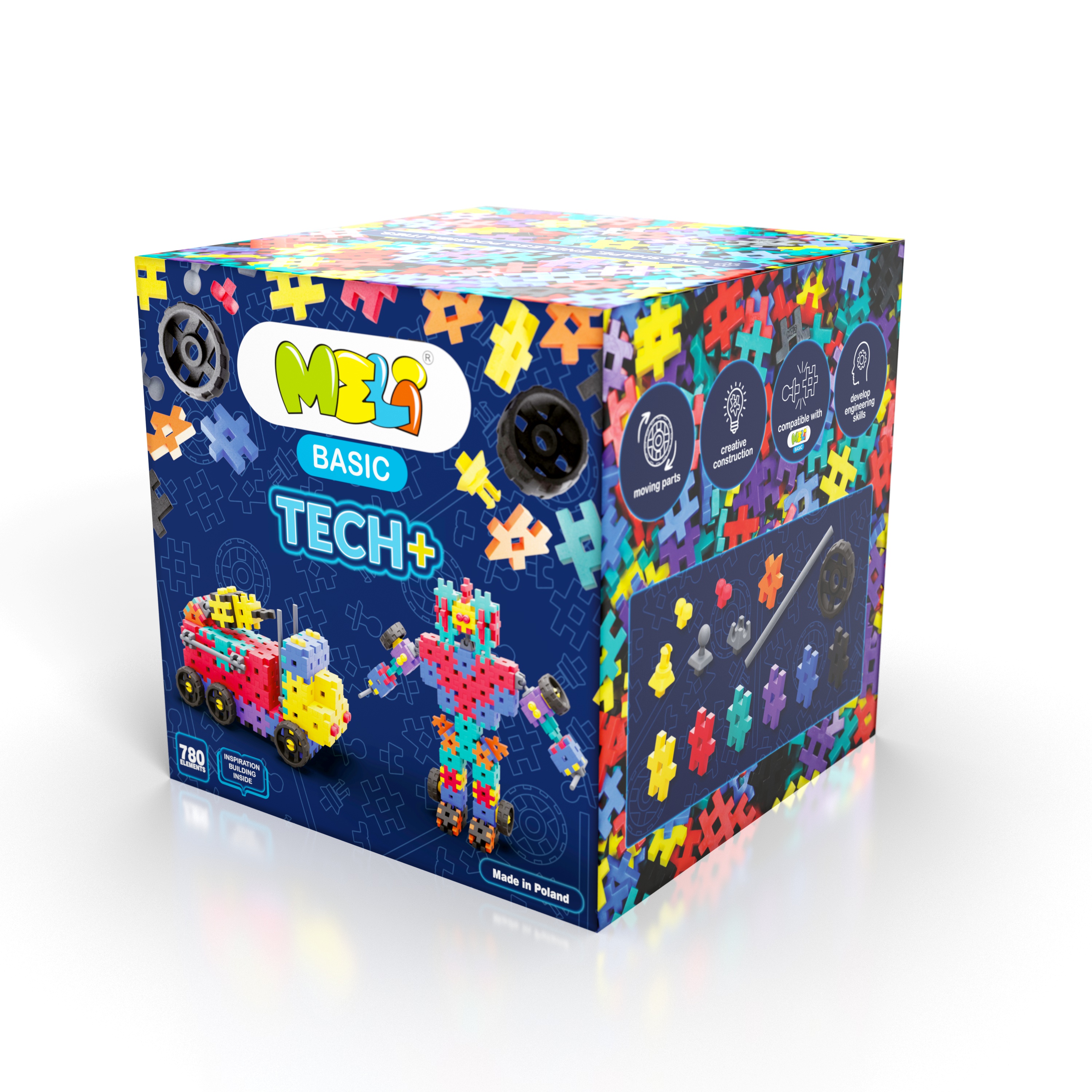 Meli Basic Tech+ 780 to największy i najbardziej rozbudowany zestaw w serii, stworzony dla prawdziwych pasjonatów inżynierii. Aż 780 elementów, w tym liczne koła i osie, pozwala dzieciom od 3. roku życia na budowanie potężnych pojazdów i skomplikowanych maszyn z wieloma mechanizmami ruchu.