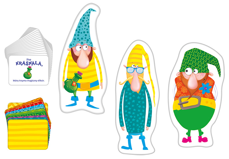 W pudełku znajdziesz zestaw kolorowych krasnali, karty z zadaniami oraz karty ze wzorami, które pozwalają rozgrywać różne warianty gry.