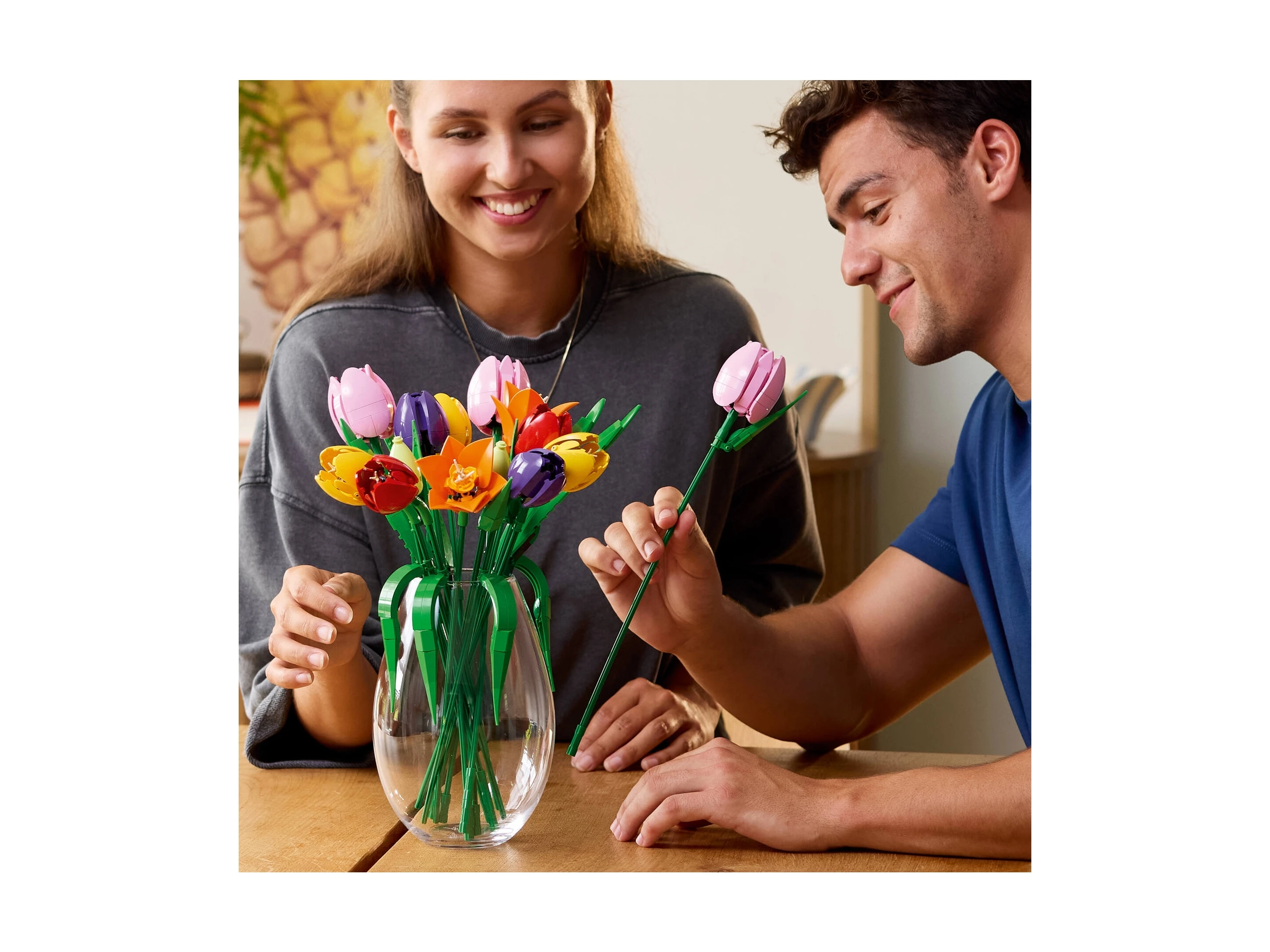 Ten kolorowy zestaw z serii LEGO Botanical Collection pozwala zbudować piękny bukiet składający się z pięciu odmian tulipanów, uchwyconych na różnych etapach kwitnienia. W komplecie znajdziesz zielone pąki, fioletowe tulipany w fazie zamkniętej oraz w pełni rozwinięte kwiaty w odcieniach czerwieni, żółci i różu. Całość kompozycji dopełniają zielone liście, które dodają kwiatom autentyczności, a regulowane łodygi pozwalają na swobodne dopasowanie wysokości roślin do każdego wazonu.