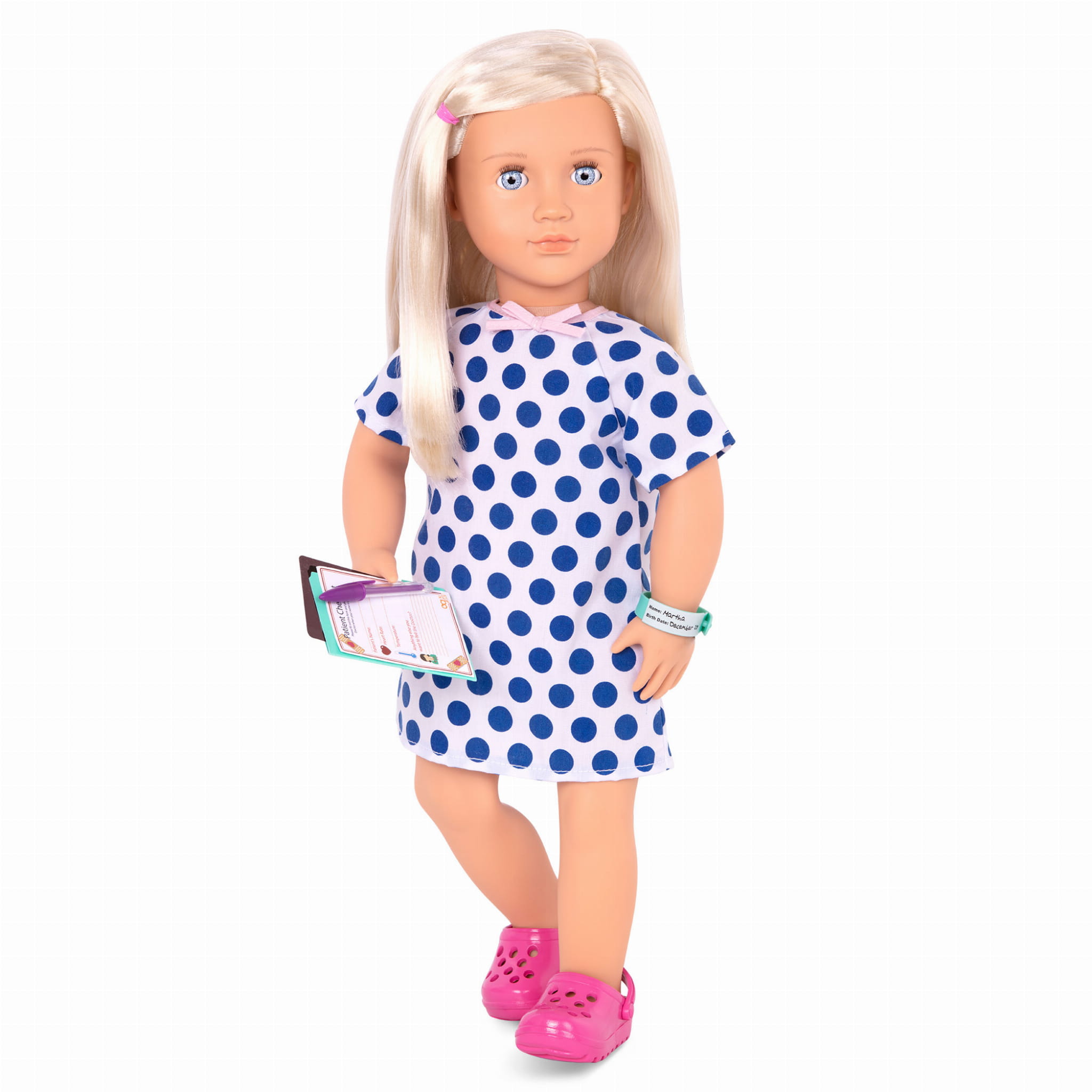 Martha, to wyjątkowa lalka marki Our Generation, która ma piękne, długie włosy. Martha to pacjentka szpitala z nogą w gipsie, kulami ortopedycznymi, maseczką i zestawem akcesoriów tematycznych.