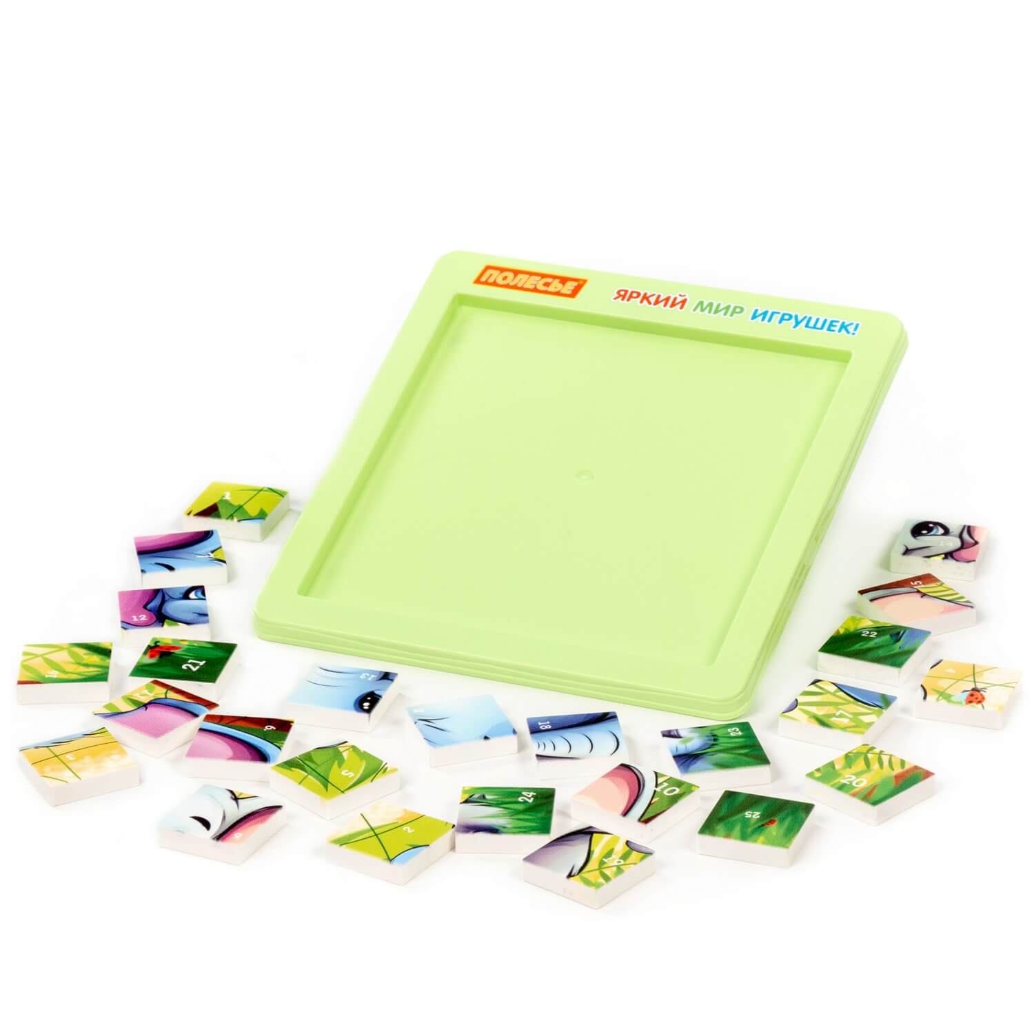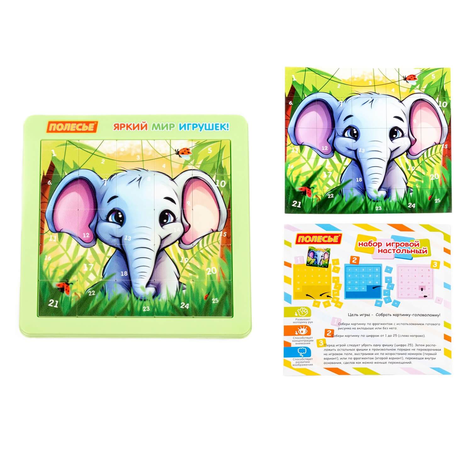 Zawartość zestawu: plansza z przesuwanymi żetonami, wkładka z obrazkiem i propozycjami gry