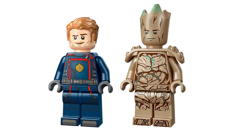 - Dobrze znane postacie – zestaw zawiera dwie kultowe minifigurki, Groota i Star-Lorda, a także kwaterę do zbudowania z narzędziami, gadżetami i stołem