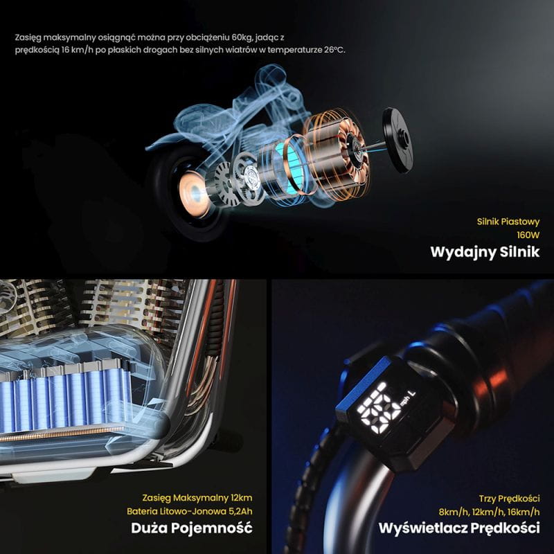 - Tryby prędkości: 8 km/h, 12 km/h, 16 km/h