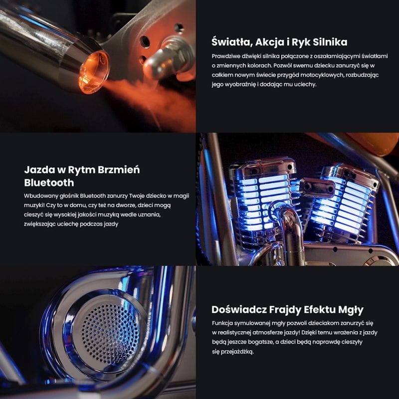 Motocykl zapewnia autentyczne efekty dźwiękowe silnika oraz zapierające dech w piersiach światła LED, które zmieniają kolory. Dzięki temu dziecko zostaje wciągnięte w świat pełen przygód i emocji, rozwijając wyobraźnię oraz ciesząc się zabawą.