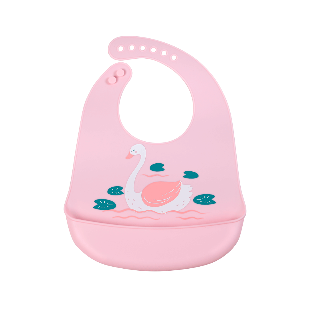 Śliniak silikonowy z kieszonką z kolorowym nadrukiem łabędzia od marki Simed, który ochroni ubranka przed zabrudzeniem.
