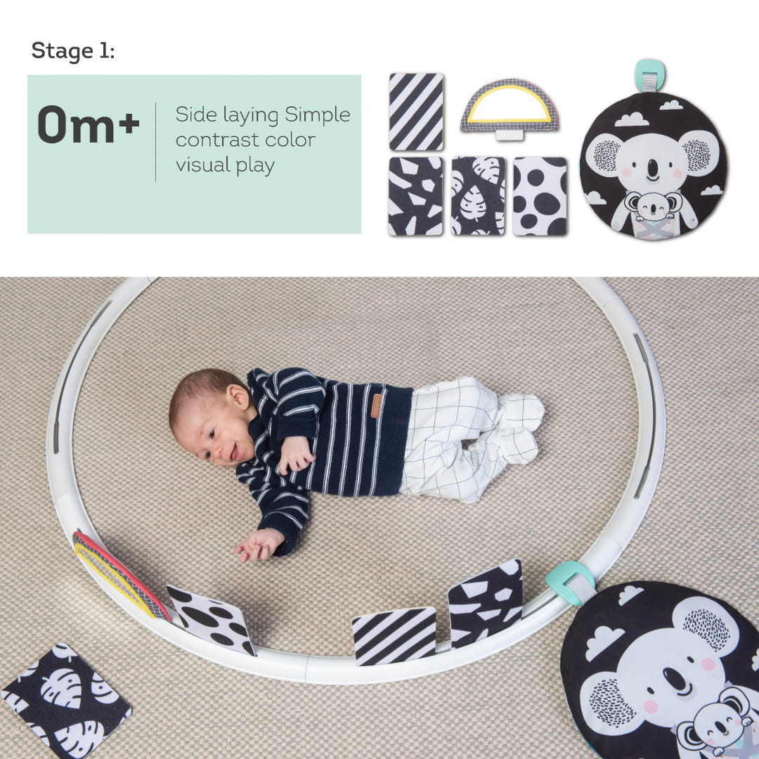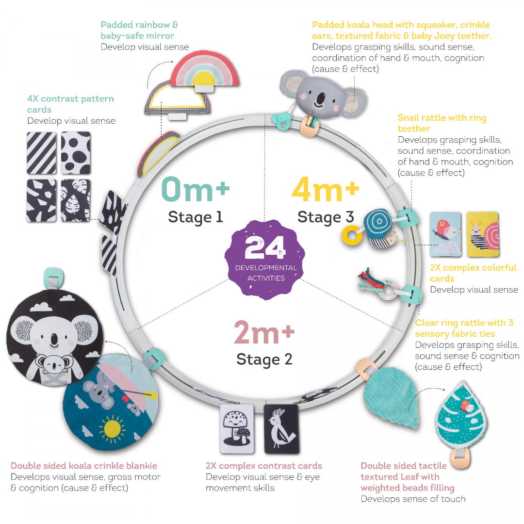 - Etap 2: (2-3m): Zawiera 4 kolorowe filcowe karty graficzne, okrągły dwustronny miękki panel Koala z marszczonym wypełnieniem i ważony teksturowany liść wypełniony plastikową fasolką. Promuj rozwój motoryki dużej i wzroku dziecka podczas leżenia na plecach/boku/na brzuszku.