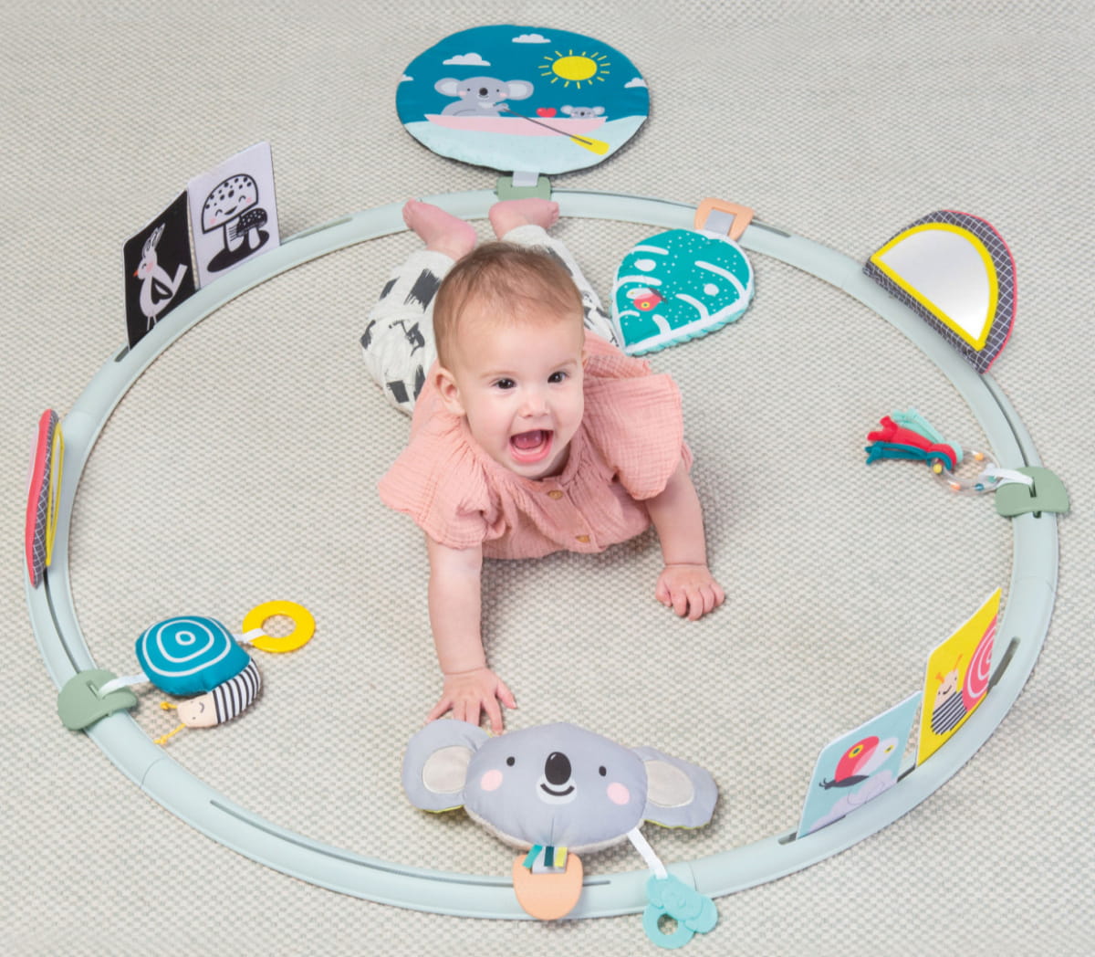 Okrągła obręcz, która otacza Dziecko i zapewnia mu wiele zajęć dopasowanych do wieku, zachęca do ćwiczenia różnych pozycji ciała podczas zabawy. Zawiera aż 24 elementy, które wpływają na rozwój malucha m.in: