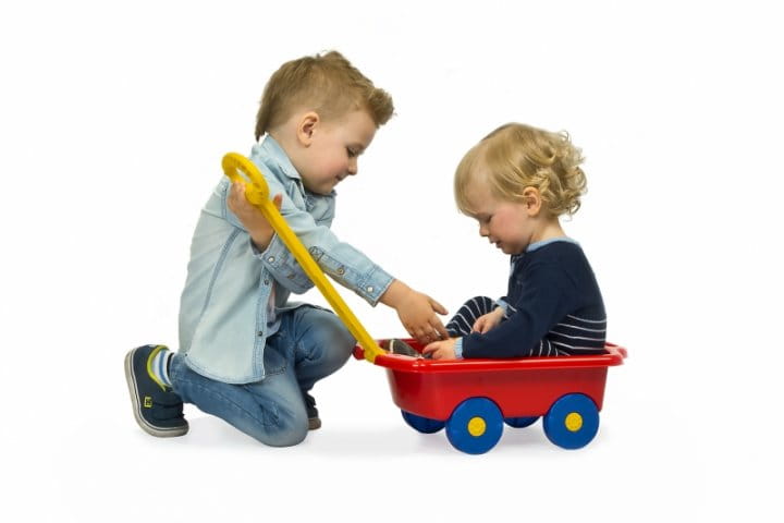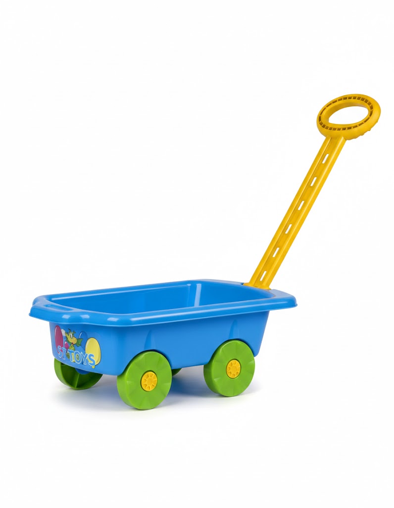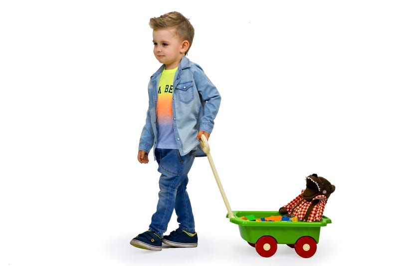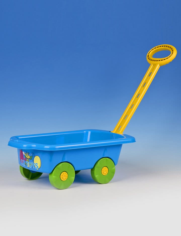 Wózeczek - przyczepka jest idealną zabawką zarówno w domu jak i na podwórku, placu zabaw czy plaży. Można w nim przewozić zabawki do piasku, wozić misie czy lalki. Wózek posiada ruchomą rączkę, więc dziecko może się nim bawić niezależnie od wzrostu.